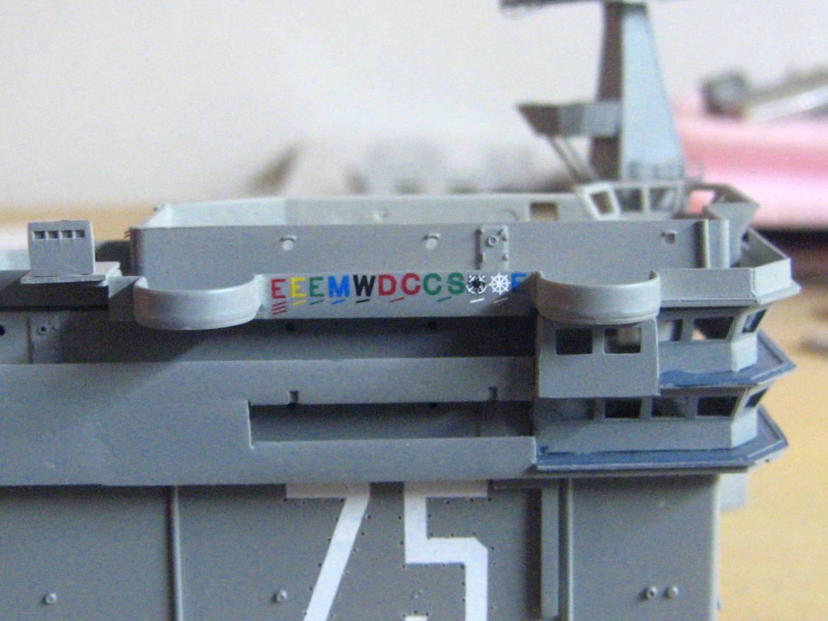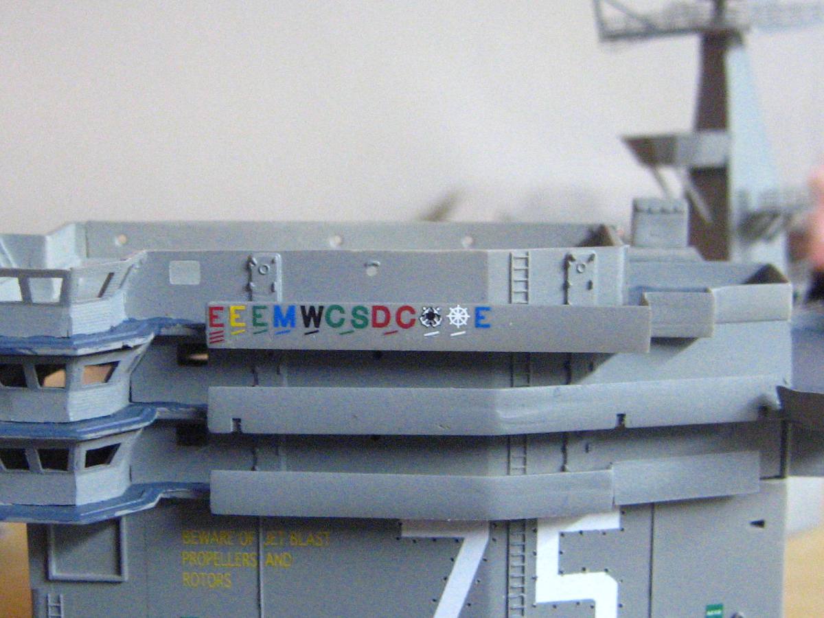 I finally got ahold of the cruise book from this specific deployment, so I was able to place teh correct awards on the island. Using the photos in the book for a scale comparison, it seems that my 2 options for the awards were both a little off as to their size. It looks like the smallest awards are about 20-25% too small, and the next size up looked to be 20-25% too large. I decided on the larger awards after trying the smaller ones, and they looked way too tiny and had me squinting to distinguish one from another. I think these larger ones look much closer to accurate.