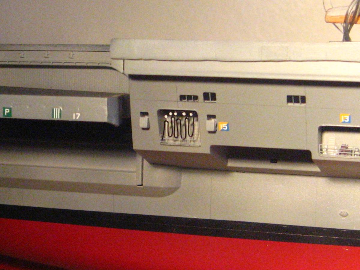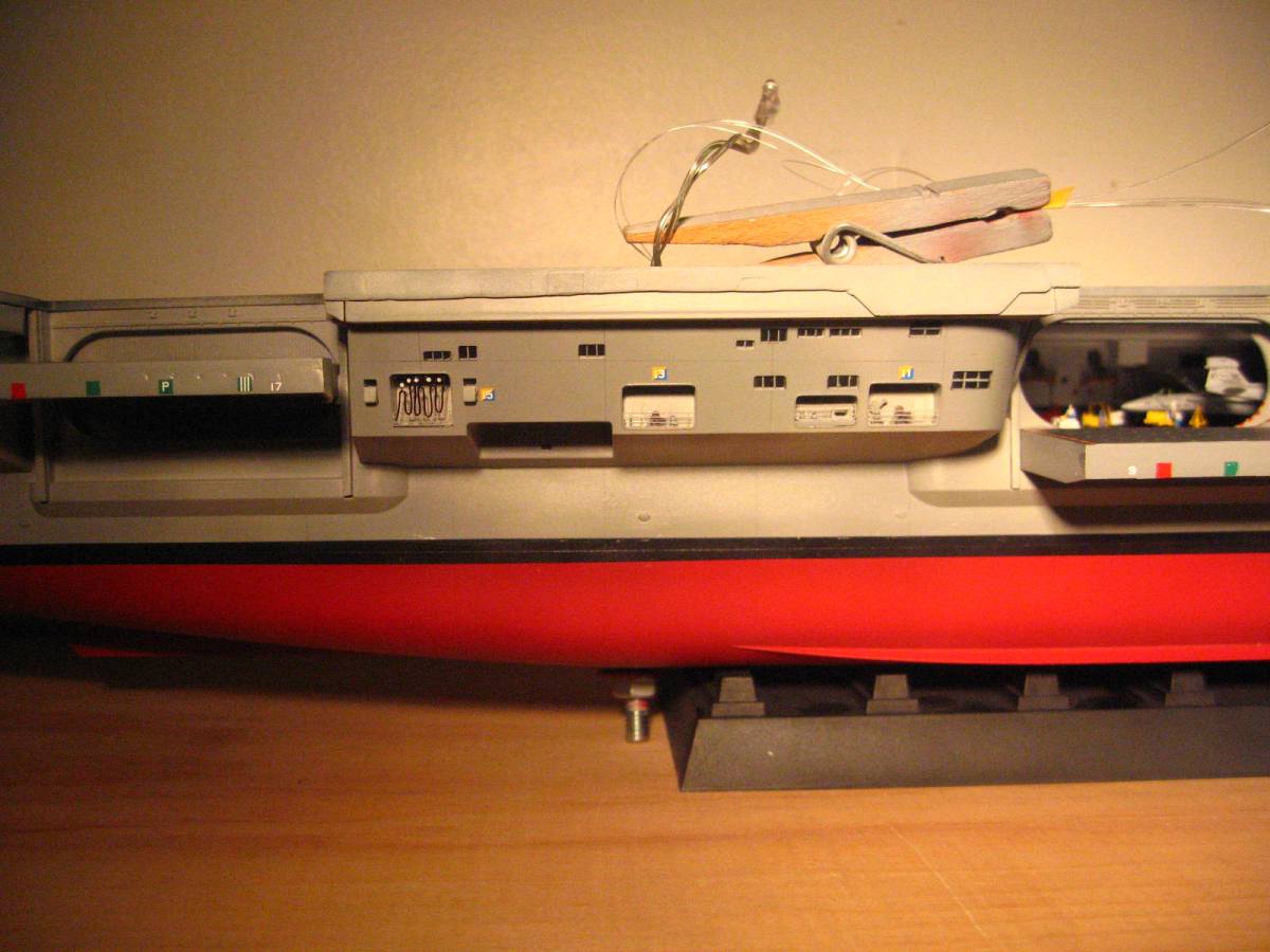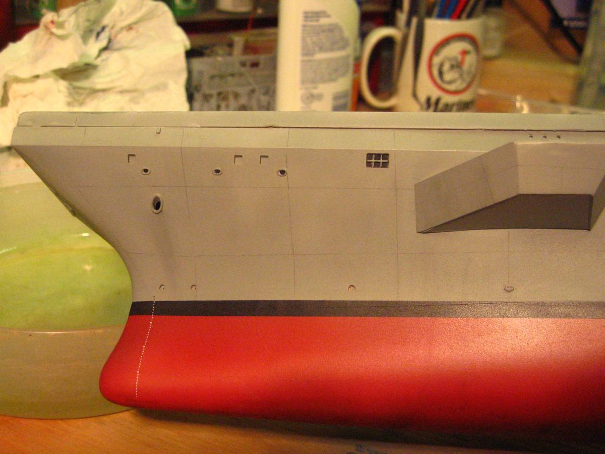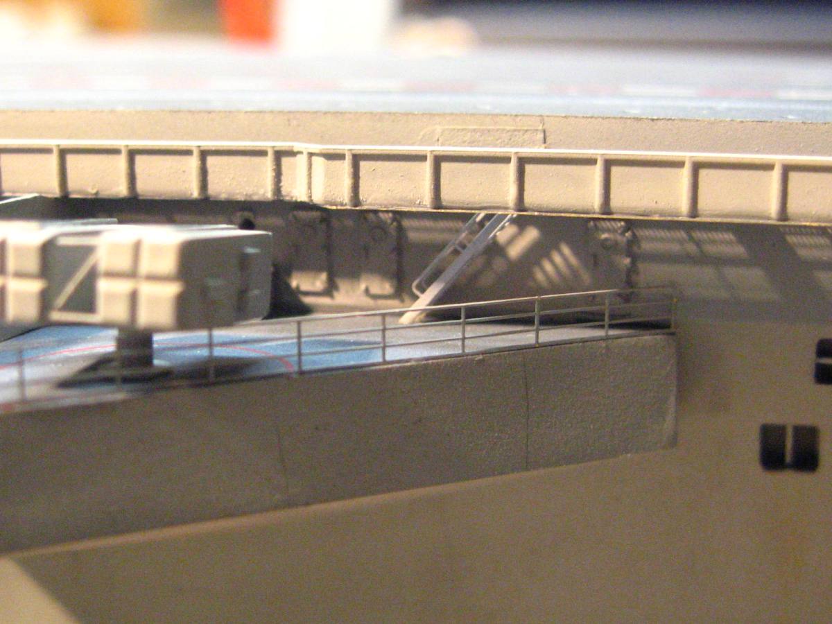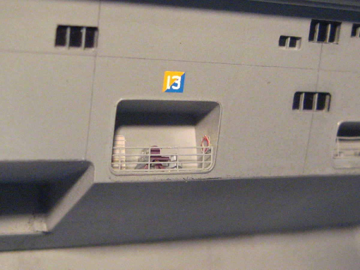 Also, I have just about finished detailing the hull and will be weathering soon. I added fiber optic lights in the unrep bays, I hope the effort was worth it when I actually light her up. I also added scratch built details to some of the unrep bays so simulate teh refuling stations, adn I painted them purple for the "Grapes" to ID them! I'll have to take some close ups later of these areas.