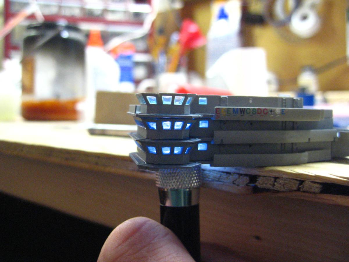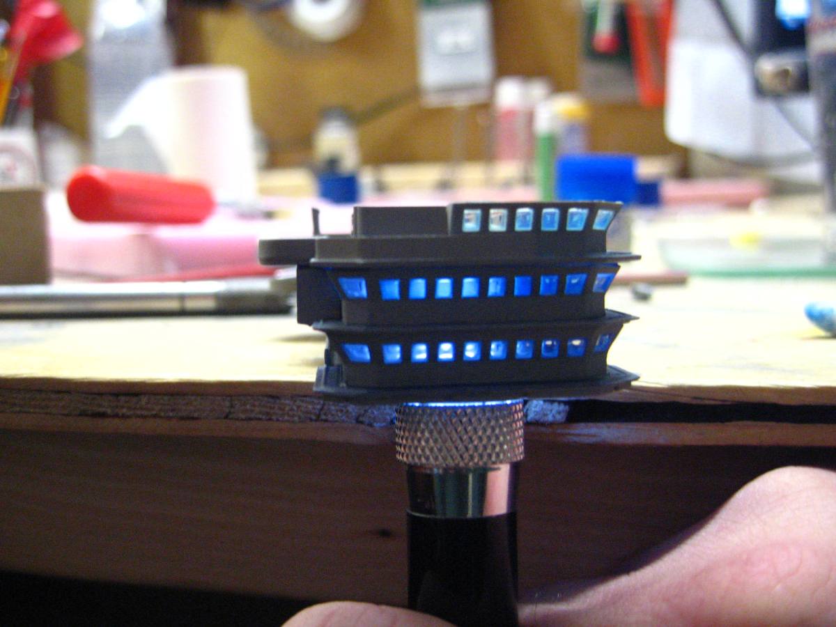 Stealing Kelly Quirk's awesome idea of lighting the island lights, I attempted it and I like the results! On the port side "5" I probably should have used a few less lights, but it still looks good. The Starboard side fiber optics have not been installed yet, but I drilled fewer holes on that "5".