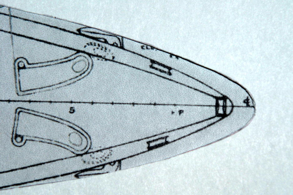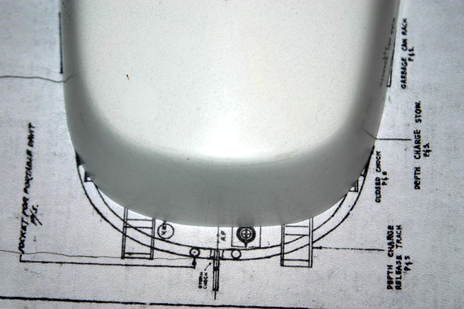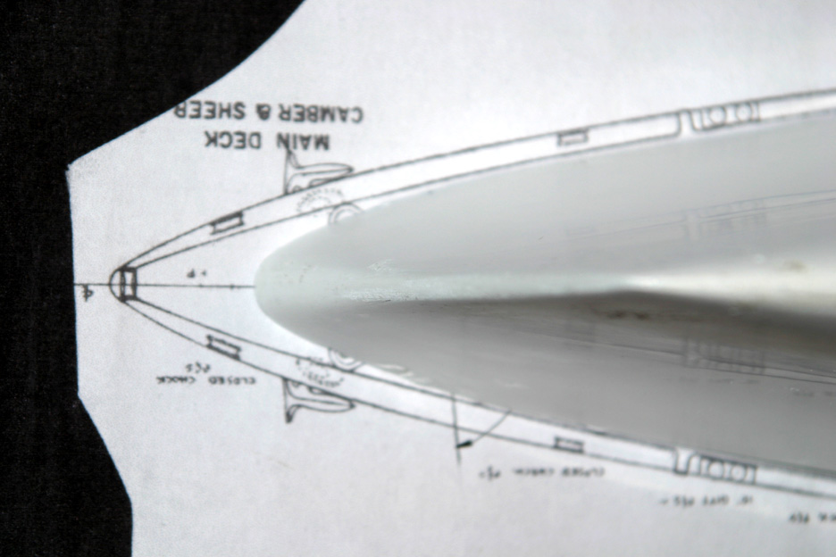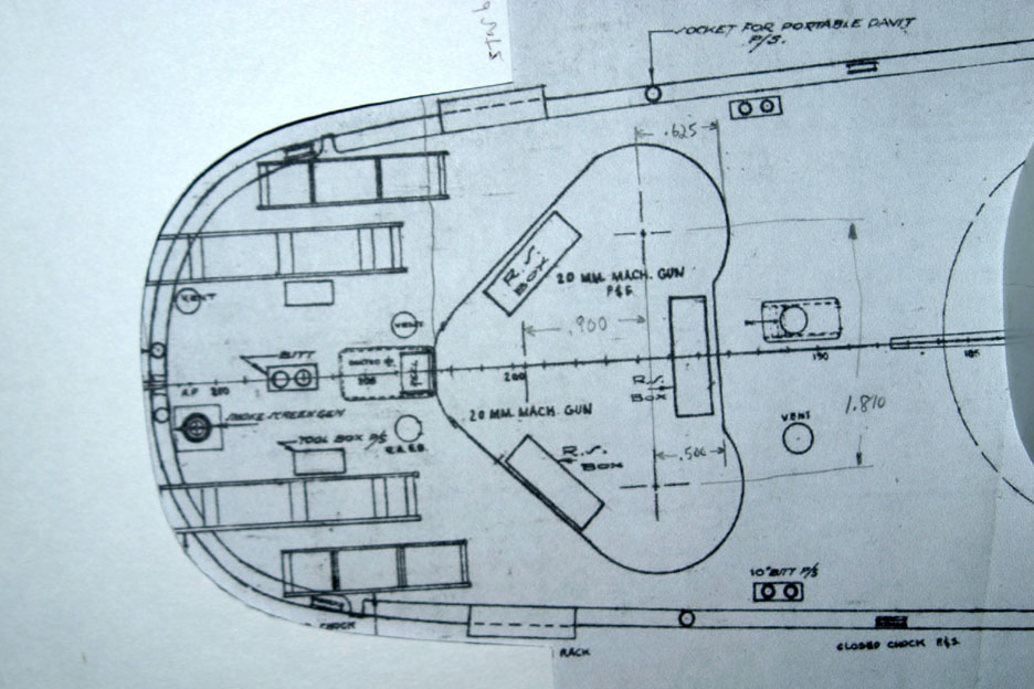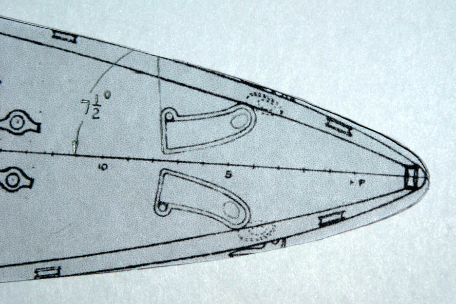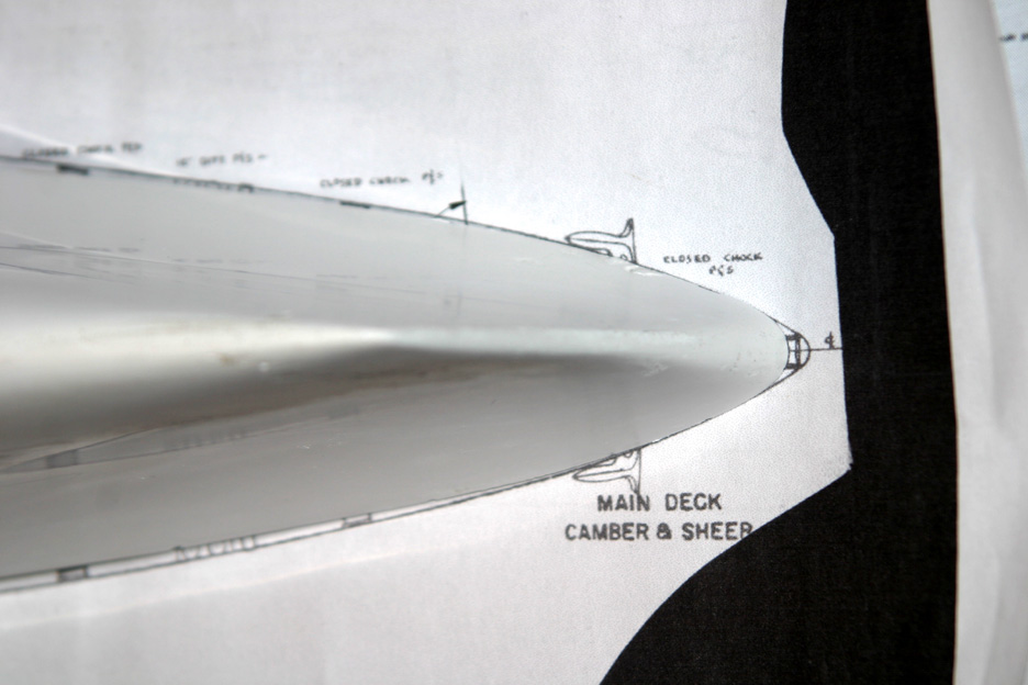 I traced the shape of the bow and stern on a piece of card stock and cut them out. The card stock cut out is on the main deck plan as seen in four photos in this post.