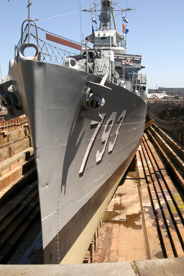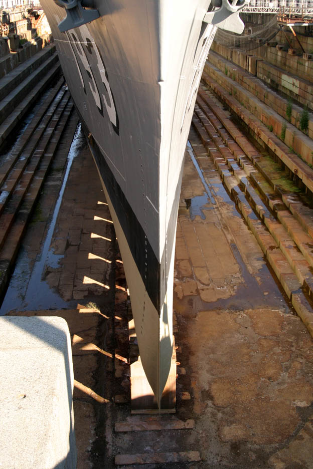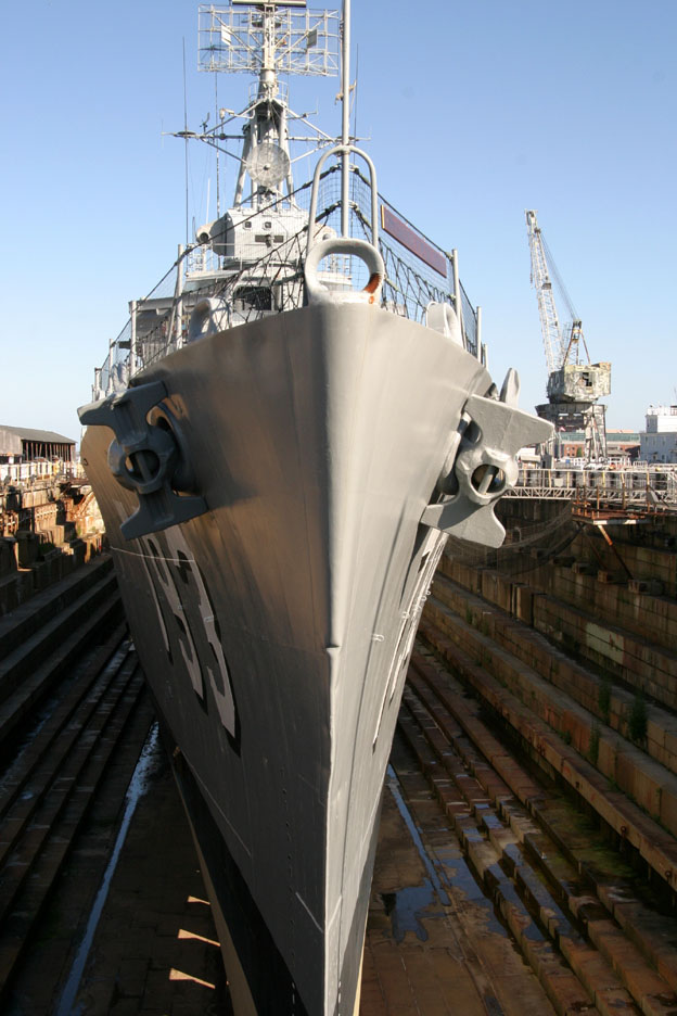 Photos of the USS Cassin Young DD-793 at the Charlestown Navy Yard in Boston MA taken this father's day. These photos show the shape of the leading edge of the bow. Notice at the top it is almost the same width as the bow chock. Also notice that below the radius at the top of the bow the hull comes to a knife edge and at the bottom it bulges out.