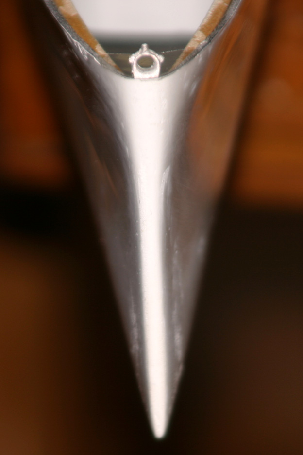 Options I�m considering to correct the shape of the hull. First I�m going to correct the shape of the bow and add � inch in length at the same time. I have a strip of brass 1/32� x �� I will have the leading edge of the bow contour on one side and have three or four prongs on the opposite side. I�ll drill holes in the bow and glue the brass cut out in place and apply some Bondo and reshape it according to the plans.
