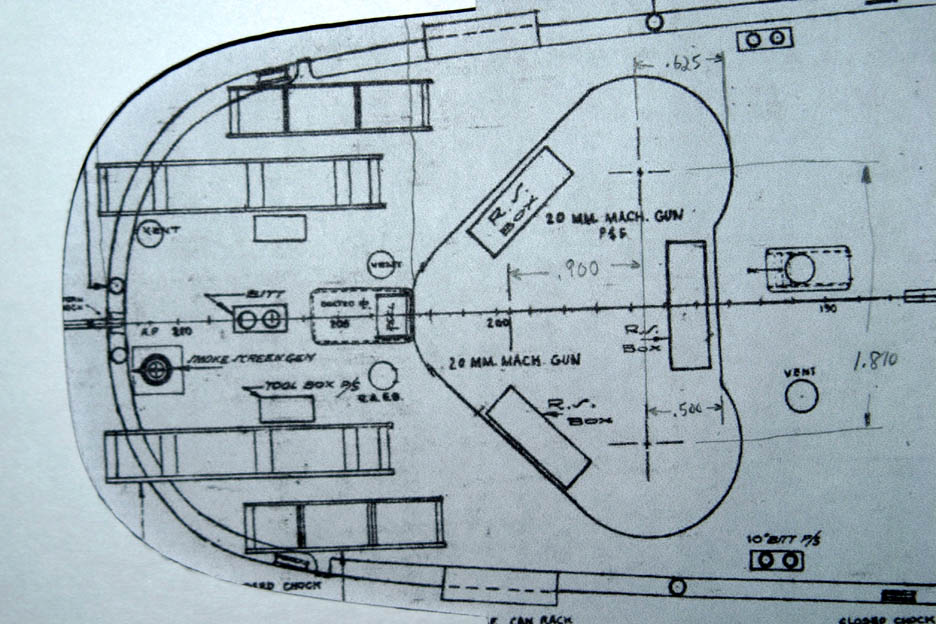 A couple of posts back you attached a photo of the rear deck blueprint which included the heart-shaped tub for the triple 20mm guns. Is this the same tub which they used for the conversion to handle 3 40mm twin Bofors? Or was that 40mm tub larger?