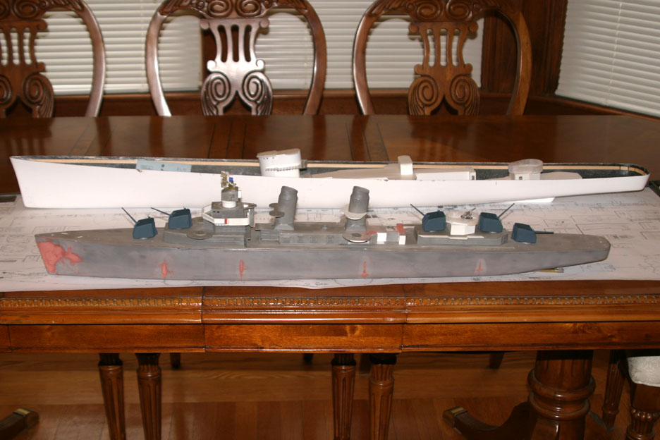 The overall length of a Fletcher is 376� 5� which translates to 47.052 inches in 1/96 scale. With the hull laying flat on my dining room table I placed a square against the tip of the bow and stern and the hull measures 46.812 inches long which is almost .240 (1/4) of an inch too short.