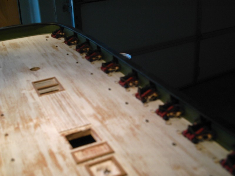I was looking at the second deck gratings, and it didn't look quite right just laying on the deck. I took out a beam and removed the grates. I made a riser to lift it off the deck, and surrounded them with canon balls. I made the chain wales, and have started to put them on. Sorry once again for the fuzzy photos, I just cannot seem to get the camera to focus close up. You can compare some of my first photos, and they are much better, at least most of them. I squared off 1/2 inch long nails to simulate the bolts holding the chain wale supports. I wonder if I should bother with the knees under the wales? They would be kind of small, about 1/4 inch by 1/2 an inch?