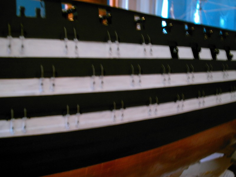 Here are three photos of my gun port work so far. I have one side almost done (with regard to the gun port fixtures). I need to put the scuttle ports on the doors yet, repaint the sides, and add the lift ropes. A question about the lift ropes, where they enter the hull, on the real ships they had a lead pipe to run the ropes through, it is hammered over on the lips. how, or where, could I build or find small (1/16th inch) eyelets? Should I just forget that detail and simply drill the hole and run it through with out the "lining"?