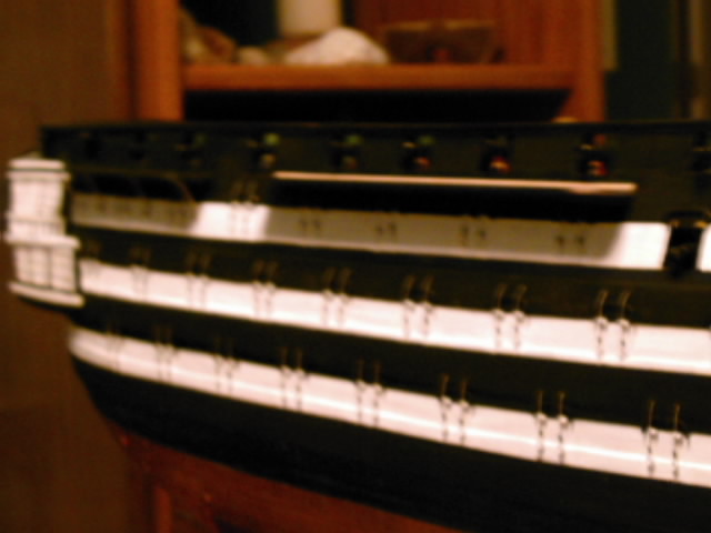 I have all of the gun port lids installed on the port side. I have messed up the paint job quite a bit. After I have the hinge straps all glued on, and BEFORE I add the lift ropes, eyebolts and rings, I will take a couple of photos and post them. Should be sometime around 5/30/2010. If sooner, well, it will be sooner! :big_grin: