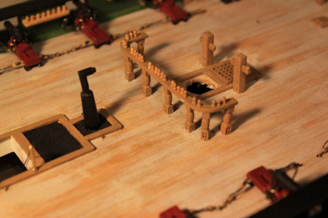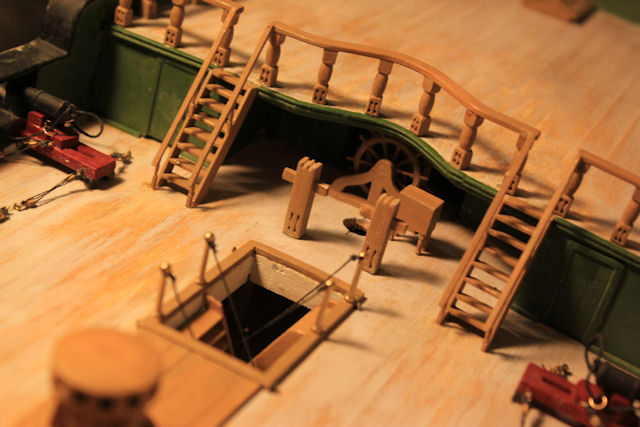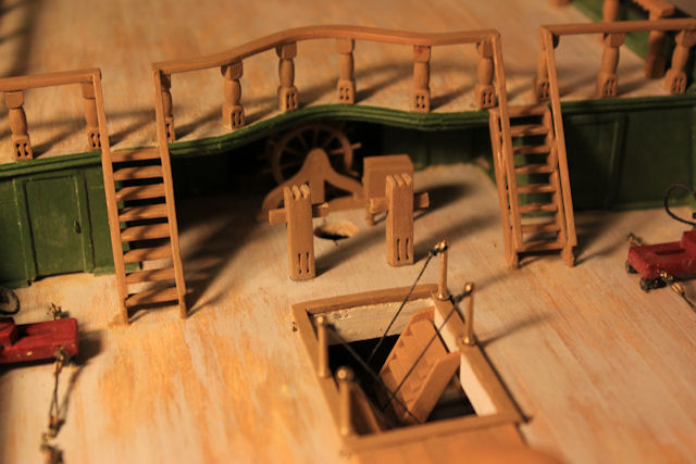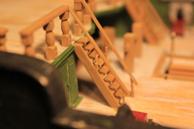 As I was installing the poop deck ladder railings I was sighting one in and looked down the deck from the bow and noticed the stairs were slanted, forgot to allow for the curve of the deck, so, i am readjusting them now. Photos will be coming soon.