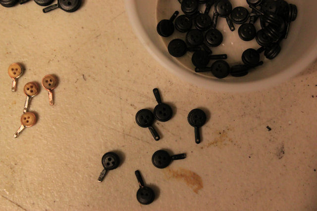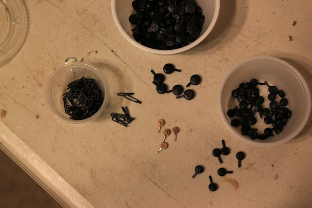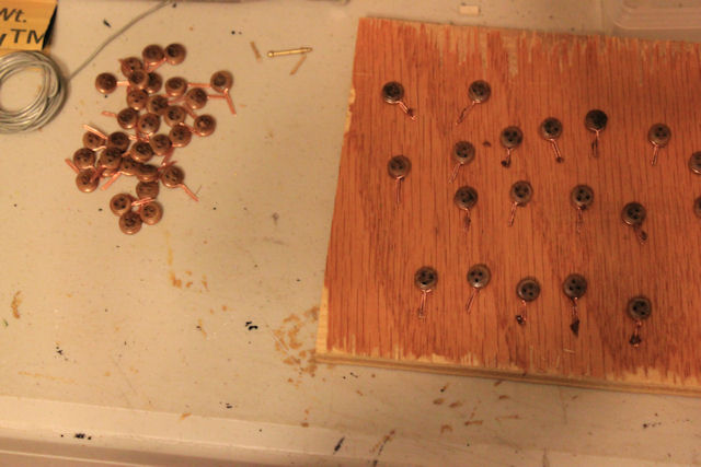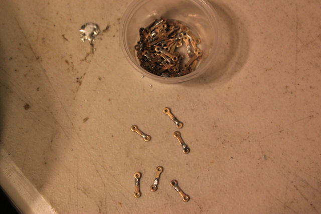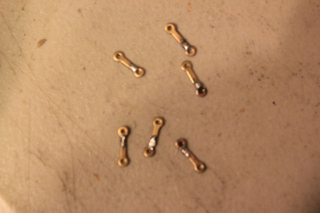 been working on deadeyes and chain. the bones had to be cut down 3/16 of an inch and resoldered, now I need to file them smooth and paint them. 'I did a simple twist of copper wire around the deadeyes, soldered them and drilled the holes by hand. The loop chain are 1/2" long and also soldered at ends and hand drilled holes. There is one more section of chain, but, it is just square stock. I am going to cut sown stick pins for the "bolts". I am also putting the rudder on and smoothing out the copper tape where it peeld back from handling.