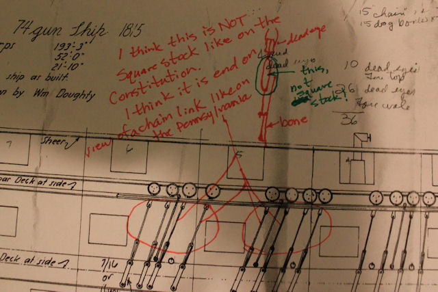 I think the blue Print view shows a side on view of another link of chain, a skinny oval like on the Pennsylvania. The way it attaches to the bottom chain link and the Dead eye just does not look like it would work with square stock. What do you guys think?